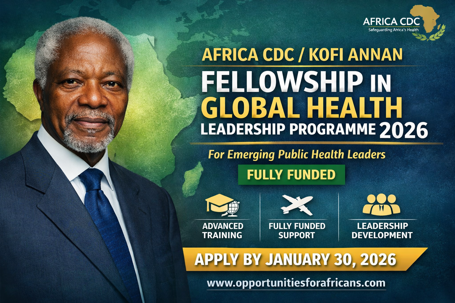 Africa CDC/Kofi Annan Fellowship in Global Health Leadership Programme 2026 (Fully Funded) Admin, December 19, 2025December 19, 2025 Application Deadline: January 30, 2026 The Africa Centres for Disease Control and Prevention (Africa CDC), in collaboration with the Kofi Annan Global Health Leadership Programme, is now accepting applications for the 2026 Fellowship. This prestigious fully funded initiative nurtures a new generation of public health leaders equipped to advance Africa’s Health Security and Sovereignty Agenda. Designed for visionary professionals committed to improving health outcomes across the continent, the Fellowship empowers participants with advanced leadership, strategic management, and policy implementation skills to transform Africa’s public health landscape. About the Fellowship Since its inception, the Africa CDC/Kofi Annan Fellowship has built a strong community of health professionals across the continent. To date, 84 Fellows from over 34 African countries have successfully graduated, many of whom now lead national health programs, spearhead cross-border collaborations, and influence policy reforms. One former Fellow even serves as a Minister of Health, demonstrating the transformative impact of the program. This Fellowship is more than a training experience — it’s a launchpad for Africa’s next generation of public health leaders. Who Should Apply The Fellowship is tailored for senior public health professionals from African Union (AU) Member States working in both the public and private sectors. It welcomes individuals with backgrounds in: One Health Human medicine and epidemiology Sexual and reproductive health Public mental health and animal health Health policy and systems management Finance, health economics, and related fields Applicants should demonstrate strong leadership potential and a passion for advancing Africa’s public health systems. Eligibility Criteria To qualify for the 2026 Africa CDC/Kofi Annan Fellowship, candidates must: Be a citizen of an African Union Member State. Hold a postgraduate degree in a field related to public health. Have a minimum of 10 years of professional experience after completing a Master’s degree. Be currently employed full-time in a public or private health institution. Demonstrate a proven or emerging capacity for strategic leadership and management in public health. Fellowship Benefits Successful Fellows will receive comprehensive support to enhance their learning and leadership journey, including: Full access to digital and in-person learning resources. Travel costs, insurance, and daily allowances for residential placements. Technical and software support for online learning. The program integrates both virtual and residential modules, ensuring Fellows gain global perspectives while maintaining connections with local public health realities. Selection Process An independent committee composed of experts from the African Union Commission, Africa CDC, and global partners oversees the selection process. The Fellowship emphasizes equal opportunity and diversity, ensuring fair representation of women and underrepresented groups. The selection committee evaluates candidates based on their professional achievements, leadership potential, and proposed leadership challenge projects. Application Process Applicants are required to submit a complete online application that includes: A letter of support from their current employer confirming participation approval. Two letters of recommendation from professional referees. A personal statement (maximum 400 words) describing their public health commitment and leadership vision. A Leadership Challenge Project Proposal (maximum 400 words) that highlights a pressing public health issue they aim to address. Note: Incomplete applications or email submissions will not be considered. Key Dates Application Deadline: 30 January 2026 Notification of Selection: 30 April 2026 Programme Commencement: 1 June 2026 Why This Fellowship Matters The Kofi Annan Global Health Leadership Fellowship represents a powerful step toward achieving a resilient, independent, and health-secure Africa. By investing in visionary leaders, Africa CDC is building the capacity needed to prevent and manage health crises while driving long-term systemic change across the continent. Graduates of this Fellowship continue to shape Africa’s health future — leading groundbreaking research, influencing global policy, and mentoring the next generation of health professionals. How to Apply Interested applicants can learn more and apply through the official portal. For more information and to apply, CLICK HERE Be one of the first to see new opportunities, Follow Us on social media: Facebook, Whatsapp Channel, LinkedIn Fellowships & Scholarship opportunities Opportunities for Africans