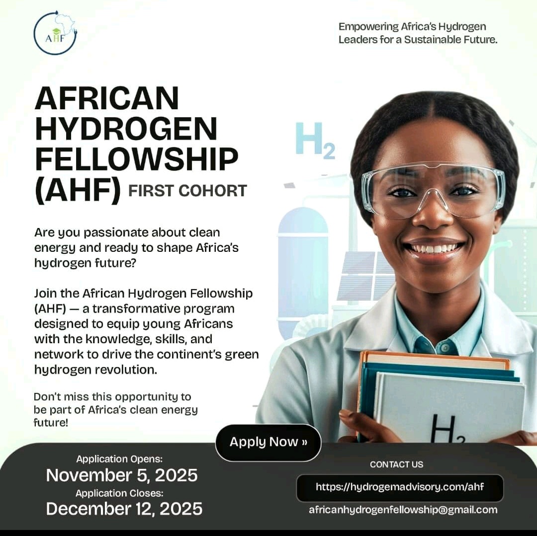 Applications Open for the African Hydrogen Fellowship (AHF) 2026 Admin, November 6, 2025November 6, 2025 Application Deadline:December 12, 2025 Africa’s clean energy future is accelerating, and young innovators are being called to lead the charge. The African Hydrogen Fellowship (AHF) 2026 is now open for applications, offering a groundbreaking six-month program that will equip the continent’s brightest minds with the skills, mentorship, and exposure needed to shape the hydrogen economy of tomorrow. Empowering Africa’s Next Generation of Hydrogen Leaders The African Hydrogen Fellowship (AHF) is an initiative designed to cultivate Africa’s next wave of hydrogen specialists and clean energy leaders. Through a dynamic blend of technical training, leadership development, and mentorship, the fellowship empowers participants to take on strategic roles in the rapidly evolving hydrogen sector. As the world pivots toward sustainable and low-carbon energy systems, hydrogen is emerging as a critical enabler of Africa’s green industrialization. AHF participants will explore hydrogen’s vast potential to transform energy production, storage, and distribution — particularly in addressing the continent’s pressing energy access challenges. What Participants Will Gain The AHF 2026 fellowship offers a holistic and immersive experience, blending theory with practice and leadership with innovation. Participants will gain: Comprehensive Knowledge on Hydrogen TechnologiesFellows will receive in-depth training on hydrogen production, storage, and utilization, exploring real-world applications that drive the global energy transition. Mentorship and Guidance from Industry ExpertsEach fellow will be paired with experienced mentors — including scientists, policy experts, and energy entrepreneurs — to receive personalized guidance and professional development support. Access to a Pan-African Network of InnovatorsFellows will join a growing network of clean energy professionals, entrepreneurs, and institutions championing Africa’s renewable energy transformation. This network provides opportunities for collaboration, partnerships, and joint ventures beyond the fellowship period. Practical Leadership and Project SkillsBeyond technical knowledge, the program emphasizes leadership, innovation, and project implementation. Participants will be equipped to design, manage, and scale hydrogen-related projects that create measurable impact in their communities. Why Hydrogen Matters for Africa Hydrogen is increasingly viewed as a game-changer for Africa’s energy landscape. Its versatility allows it to complement renewable energy sources such as wind and solar, enabling energy storage and supporting the decarbonization of transport, manufacturing, and heavy industries. By training young professionals in this emerging field, the African Hydrogen Fellowship contributes directly to Africa’s sustainable development goals, energy security, and industrial competitiveness. Participants will not only gain technical expertise but also become ambassadors for innovation and climate resilience across the continent. Program Overview Host Institution: HydroGEM Energy Advisory Program Duration: Six months Funding Type: Fully Funded Coverage: Pan-African The fellowship is fully funded, ensuring that talented individuals from across Africa can participate regardless of their financial background. Fellows will engage in structured learning modules, mentorship sessions, and collaborative projects aimed at creating scalable clean energy solutions. Eligibility Criteria The AHF 2026 Fellowship welcomes young professionals who are passionate about renewable energy, sustainability, and innovation. Applicants must demonstrate a strong interest in driving Africa’s clean energy transition and show potential for leadership within their respective fields. Eligible candidates must: Be citizens or residents of any African country Have a background or interest in renewable energy, environmental science, engineering, or related fields Be committed to applying their learning to real-world energy challenges in Africa Application Deadline The deadline for submission is 12 December 2025. Interested applicants are encouraged to apply early to secure their spot in this transformative fellowship. How to Apply To apply, visit the official application portal via the link below and complete the online form with your personal details, motivation statement, and supporting documents: The African Hydrogen Fellowship (AHF) 2026 presents a rare opportunity for young Africans to gain hands-on experience in one of the most promising energy fields of the future. By fostering innovation, leadership, and collaboration, the fellowship is paving the way for a sustainable, hydrogen-powered Africa. Aspiring clean energy leaders are encouraged to apply and become part of this pioneering journey toward a greener and more prosperous continent. For more information and to apply CLICK HERE Be one of the first to see new opportunities, Follow Us on social media: Facebook, Whatsapp Channel, LinkedIn Fellowships & Scholarship opportunities Opportunities for Africans