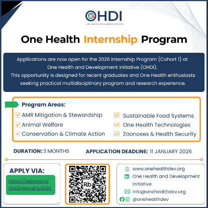 Apply Now for OHDI Internship Program 2026 Admin, December 30, 2025December 30, 2025 The One Health and Development Initiative (OHDI), a Nigeria-based nonprofit organization, focuses on the interconnected health of humans, animals, plants, and the environment through projects, training, online resources, and community efforts. They have announced that applications are open for the OHDI Internship Program 2026. This program is intended for recent graduates seeking practical experience in One Health-related fields, along with development of professional skills and exposure to real-world applications. Program Overview The internship allows early-career participants to assist with initiatives involving public health, animal welfare, environmental sustainability, and development. Tasks may include supporting research, project implementation, coordination, communications, and knowledge management, in line with the organization’s focus areas. Available Focus Areas Applicants can choose one area matching their background: Antimicrobial Resistance Prevention and Responsible Use Animal Welfare and Sustainable Farming Practices Biodiversity Conservation and Climate Resilience Sustainable Plant-Based Food Systems Innovative One Health Technologies Zoonotic Diseases and Global Health Security Work in these areas may cover policy, research, community outreach, and integrated strategies. Program Details Duration: 3 months (approximately 20 hours per week) Format: Remote or hybrid Start Date: February 1, 2026 Participants are expected to maintain regular commitment, deliver assigned tasks, and engage in activities. Eligibility Candidates must: Hold at least a Bachelor’s degree Show interest in One Health, sustainability, or related topics Demonstrate readiness to learn, collaborate in teams, and contribute Reported Participant Outcomes According to the organization, interns may gain: Involvement in One Health projects Exposure to cross-disciplinary approaches Mentorship and skill-building Experience in a nonprofit environment Contribution to global health and sustainability efforts Application Information Applications are submitted through the organization’s online form Deadline: January 11, 2026 Only shortlisted applicants will be contacted. For full details and to apply, visit the official OHDI website. Fellowships & Scholarship opportunities