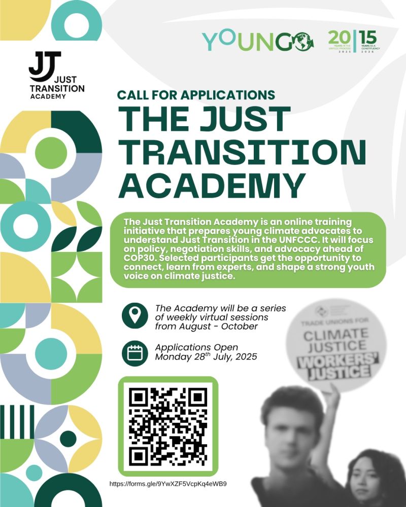 Apply Now: YOUNGO Just Transition Academy — A Fully Online Global Program for Young Climate Leaders Admin, August 3, 2025August 3, 2025 Application Deadline: August 12, 2025 The Just Transition Working Group of YOUNGO, the official youth constituency of the UN Framework Convention on Climate Change (UNFCCC), has launched a groundbreaking new initiative: the Just Transition Academy. This fully online global program invites passionate young people from around the world to become part of a movement that places justice, equity, and inclusion at the center of climate solutions. The initiative aims to empower young leaders to take on challenges within their communities and advocate for policies that are inclusive and equitable. By addressing the climate crisis with a justice-oriented approach, participants will learn to prioritize the needs of vulnerable populations while striving for sustainability. Throughout the program, participants will engage in practical workshops designed to enhance their skills in public speaking, negotiation, and coalition-building. These are critical abilities that young activists need to influence change effectively. Designed for young climate professionals, students, activists, and community organizers, the program offers a transformative experience that combines expert-led learning, peer collaboration, and actionable strategy development. Whether you’re already engaged in climate work or looking to deepen your advocacy in time for COP30, this opportunity is tailor-made for emerging leaders ready to shape a more inclusive and sustainable future. Furthermore, the curriculum will include case studies highlighting successful just transition initiatives worldwide, providing real-world examples of how determined individuals and communities have turned challenges into opportunities for growth and resilience. Participants will also be encouraged to collaborate on projects that address local environmental issues, fostering a sense of accountability and connection to their communities. This hands-on approach ensures that the learning experience is not only theoretical but also applicable in real-life scenarios. Why Join the Just Transition Academy? As the climate crisis intensifies and global energy systems rapidly evolve, the idea of a “just transition” has become a cornerstone in the climate justice discourse. This program equips participants with the knowledge, tools, and networks necessary to push for equitable transitions across sectors and regions. Key milestones during the program will also include community engagement activities, enabling participants to connect with local stakeholders and understand the ground realities they must navigate in their advocacy efforts. Participants in the first global cohort will benefit from interactive sessions led by experts, community dialogues, and exposure to key frameworks under the UNFCCC’s Just Transition Work Program. The academy also prepares participants to actively engage in international climate advocacy, with a focus on strategic participation in COP30. Program Structure & Key Dates Application Deadline: August 12, 2025 Notification of Results: Week of August 18, 2025 Program Dates: Week of September 1 – Week of October 17, 2025 Delivery Format: Entirely virtual — online sessions, collaborative group work, curated readings, and assignments This flexible seven-week format is designed to accommodate participants’ existing academic or professional responsibilities while offering a rich and engaging learning journey. The program will leverage technology to facilitate a rich, interactive learning environment, where participants can share ideas, brainstorm solutions, and develop strategies collaboratively, even from afar. What You’ll Learn Participants will explore a variety of themes that are central to climate justice and equitable transition. Core learning sessions include: Foundations of Just Transition Sectoral Deep-Dives: Agriculture, Energy, and Industry Barriers to Equitable Transition at the Global Level Understanding the UNFCCC’s Just Transition Work Program Civil Society Demands for COP30 Strategic Advocacy Skills for COP30 Participation Developing a Personal Action Plan for Climate Engagement Each session is designed to strengthen participants’ policy literacy, advocacy confidence, and strategic thinking skills in preparation for real-world action. Benefits of Participation The Just Transition Academy offers much more than just a learning experience. Participants will receive: A Certificate of Completion Insights into key sectors and the political landscape of climate justice Opportunities for future engagement through mentorship, facilitation, or advocacy roles Interactive sessions with experts, policymakers, and youth leaders Inclusion in an international network of like-minded climate advocates Practical tools for influencing national and global climate policy A platform to collaborate on intersectional and community-centered solutions Who Can Apply? This opportunity is open to young people aged 18 to 35 from all countries. Ideal candidates are individuals with: To enhance the learning experience, guest speakers from various sectors, including government, NGOs, and private industry, will share their insights and experiences, providing valuable perspectives on climate action and policy-making. A strong interest or involvement in climate justice, sustainability, or community development A desire to engage meaningfully in the upcoming COP30 negotiations Commitment of 3–4 hours weekly for seven weeks Proficiency in English (program language) Reliable internet access Participants will also gain access to a resource library filled with materials on climate justice, advocacy tools, and best practices, further enriching their knowledge and preparation for future endeavors. Be one of the first to see new opportunities, Follow Us on social media: Facebook, Whatsapp Channel, LinkedIn Applicants fro
