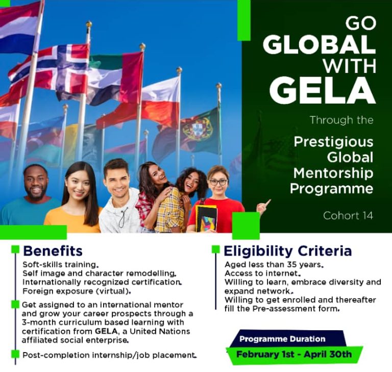 Course and Trainings Apply Now: The Prestigious Global Mentorship Programme 2026 Admin, December 12, 2025December 12, 2025 Application Deadline: January 25, 2025 The Global Entrepreneurs and Leaders Academy (GELA) has announced the 2026 edition… Continue Reading