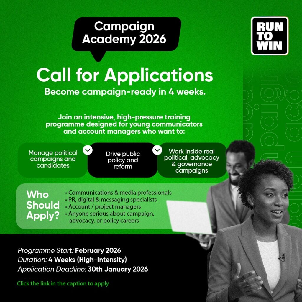 Course and Trainings Campaign Academy ’26: Launch Your Career in Nigerian Political Campaigns Admin, January 16, 2026January 16, 2026 Applications open for Campaign Academy ’26 – hands-on political campaign training in Nigeria with real election placements. Shape the future of Nigerian politics – apply now! Continue Reading