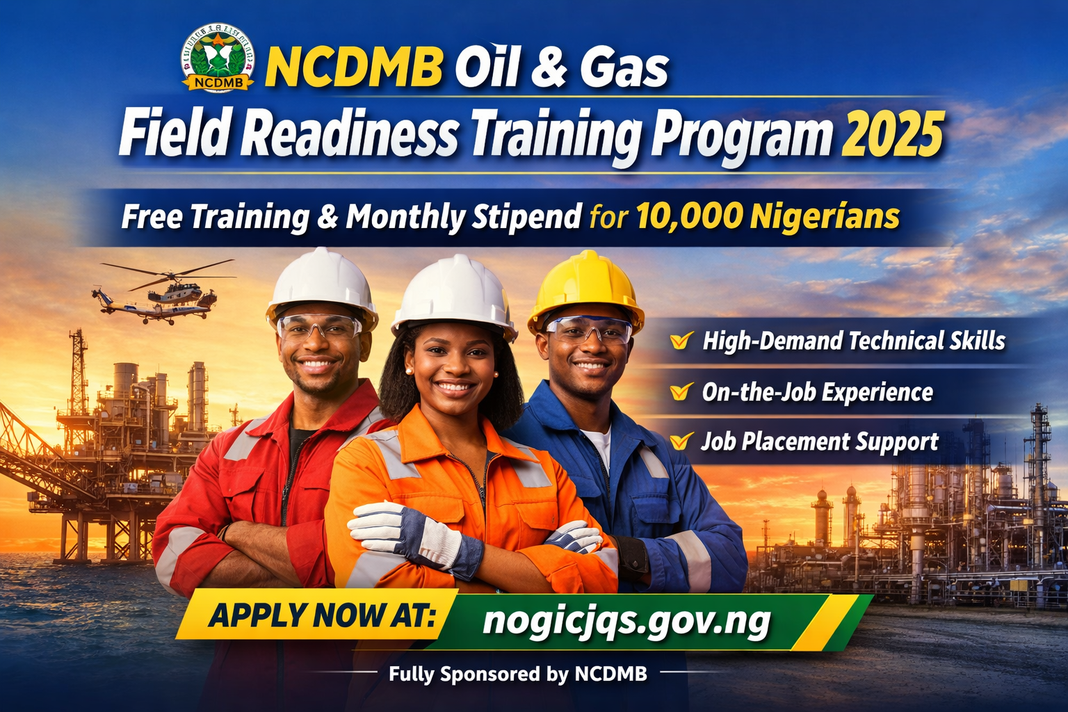 Jobs NCDMB Oil & Gas Field Readiness Training Program 2025: Free Training & Stipends for 10,000 Nigerians Admin, December 30, 2025December 30, 2025 Appllication Deadline: Ongoing The Nigerian Content Development and Monitoring Board (NCDMB) has opened applications for… Continue Reading