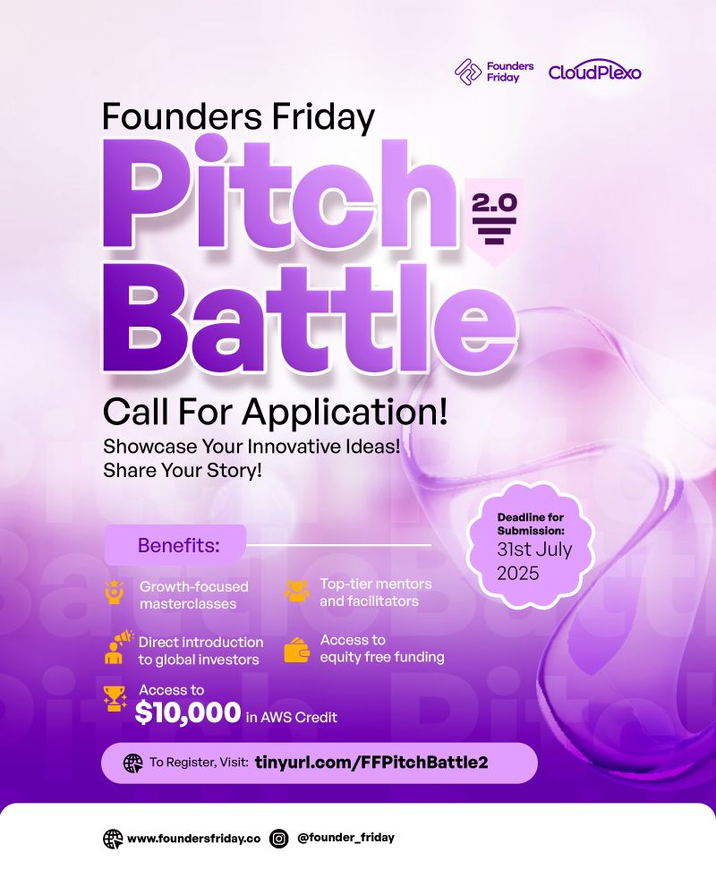 Founders Friday Pitch Battle 2.0 Now Open for Submissions Admin, July 25, 2025July 25, 2025 Application deadline : July 31, 2025 If you’re an ambitious Nigerian tech founder with a game-changing idea, now is your chance to shine. Submissions are officially open for the Founders Friday Pitch Battle 2.0, a high-energy, storytelling-powered startup competition designed to spotlight Nigeria’s most promising early- and mid-stage tech ventures. Powered by CloudPlexo, this second edition of the Pitch Battle is more than just a funding opportunity—it’s a five-day capacity-building experience that offers mentorship, visibility, and access to a strong network of investors, innovators, and ecosystem builders. What is the Founders Friday Pitch Battle? The Founders Friday Pitch Battle 2.0 is a unique startup showcase and empowerment platform, targeting bold founders from across Nigeria’s underserved and emerging innovation ecosystems. The program is built on the pillars of authentic storytelling, scalable innovation, and community-driven transformation. Set to run over five high-impact days, the initiative serves as a launchpad for startups ready to move beyond validation and into real-world implementation, growth, and investment. Be one of the first to see new opportunities, Follow Us on social media: Facebook, Whatsapp Channel, LinkedIn What’s at Stake? This edition of the Pitch Battle offers compelling opportunities for selected participants: ₦1.5 million in equity-free funding shared among winners Up to $10,000 in AWS credits Premium masterclasses and mentorship sessions Global exposure and regional storytelling platforms Networking with top VCs, accelerators, and industry leaders Beyond the financial support, the program is structured to help startups build traction, refine their business models, and secure critical support from investors and technical advisors. Who Should Apply? This opportunity is ideal for founders who are past the ideation stage and are actively developing or scaling their technology-driven startups. Early-Stage Tech Founders Entrepreneurs with validated business ideas Founders working on MVPs (Minimum Viable Products) or early-stage prototypes Tech-Enabled Startups in Key Sectors Startups building scalable solutions in fintech, healthtech, edtech, e-commerce, agritech, logistics, and other high-impact sectors Startups Seeking Growth & Investment Ventures ready to raise pre-seed or seed funding Startups looking for mentorship, investor connections, and acceleration opportunities Impact-Focused Innovators Startups solving real-world problems in underserved African markets Businesses that can demonstrate traction (e.g., user growth, product adoption, partnerships) Who Should Not Apply? To maintain a competitive and high-impact selection process, the following categories of applicants are discouraged from applying: Idea-stage founders without any clear execution roadmap Businesses without a defined business model or revenue plan Non-scalable enterprises, including traditional SMEs and consulting firms Agencies or service-based companies without a product-centric business Key Dates to Remember Applications Open: July 24, 2025 Deadline to Apply: July 31, 2025 Why You Shouldn’t Miss This With Nigeria’s tech ecosystem gaining global attention, opportunities like the Founders Friday Pitch Battle 2.0 play a critical role in propelling local innovation to international heights. Whether you’re looking to secure funding, grow your team, expand into new markets, or simply gain validation from the ecosystem, this program is tailor-made to fast-track your entrepreneurial journey For bold, tech-enabled startups working to solve Africa’s toughest problems, this is more than a pitch event—it’s a platform for visibility, impact, and scale. For more information and to apply, CLICK HERE Competition Opportunity for Nigerians