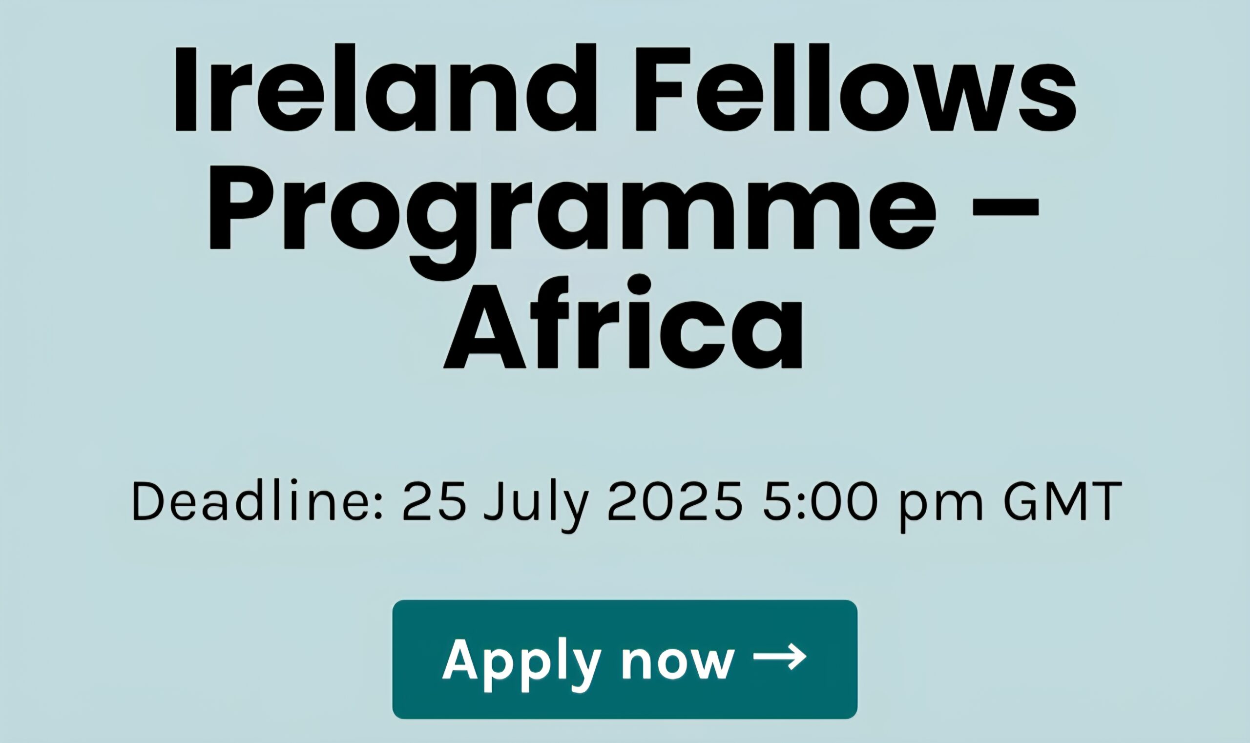 Fully Funded Ireland Fellows Programme 2025 Applications are Now Open Admin, July 3, 2025July 3, 2025 Application Deadline: July 25, 2025 The Ireland Fellows Programme 2025 – Africa is officially accepting applications. This prestigious, fully funded scholarship enables early to mid-career professionals from eligible African countries to pursue a master’s degree in Ireland. Funded by the Irish Government and managed in partnership with the Canon Collins Trust, the programme aims to support future African leaders by offering world-class education and leadership development opportunities. About the Programme The Ireland Fellows Programme supports selected applicants to undertake a one-year, full-time master’s degree at a recognized Irish higher education institution (HEI). Programmes commence in August or September 2026 and last between 10 and 16 months. Eligible disciplines include public health, education, agriculture, climate science, human rights, gender studies, business, engineering, computer science, and more. All eligible courses are listed in the official Directory of Eligible Programmes. Programme Objectives Build the leadership capacity of participants. Support the advancement of the UN Sustainable Development Goals (SDGs) in participating countries. Strengthen institutional and diplomatic relationships between Ireland and partner African nations. Promote diversity, gender equality, and inclusive access to education. What the Fellowship Covers Selected fellows will receive a comprehensive scholarship package including: Full tuition fees and university application costs. Examination and academic-related fees. Economy-class return flights to and from Ireland. Monthly living stipend. Accommodation and settling-in allowance. Book and study materials allowance. Health insurance. Visa application costs. Note: The fellowship only supports the selected individual. It does not cover dependents or spouses. Eligibility Criteria To be eligible, applicants must: Be a national and resident of one of these countries: Angola, Burundi, Democratic Republic of the Congo, Djibouti, Eritrea, Eswatini, Ethiopia, Ghana, Kenya, Lesotho, Liberia, Malawi, Mozambique, Nigeria, Rwanda, Senegal, Sierra Leone, Somalia, South Sudan, Sudan, Tanzania, Uganda, Zambia, or Zimbabwe. Hold a bachelor’s degree with at least a GPA of 3.0 (or equivalent), awarded no earlier than 2012. Have 2–3 years of professional experience relevant to their field of study. Not already hold or be pursuing a master’s or higher-level degree. Demonstrate leadership qualities, commitment to the SDGs, and an interest in promoting Ireland-country partnerships. Select three eligible courses from the official Directory of Eligible Programmes. Meet specific academic and language requirements for each course. Not have previously applied more than once to the programme. Be available to start studies in Ireland by August or September 2026. Special Application Guidelines In select countries—such as Angola, Kenya, Liberia, Malawi, Rwanda, Uganda, and others—applications may be by invitation only, especially for employees of government ministries or NGOs aligned with Irish Aid strategies. Interested candidates must confirm their eligibility through their employer or by contacting the local Irish Embassy. How to Apply Applications must be submitted online via the official portal. Only successful Stage 1 applicants will be contacted by the Canon Collins Trust for further stages. Applicants are advised not to contact Irish embassies during the selection process. Review the full eligibility and academic guidelines before submission. Deadline The deadline to apply is 25 July 2025 at 5:00 PM GMT. Early applications are strongly encouraged to avoid last-minute technical issues. For more information and to apply, CLICK HERE Fellowships & Scholarship opportunities Opportunities for Africans
