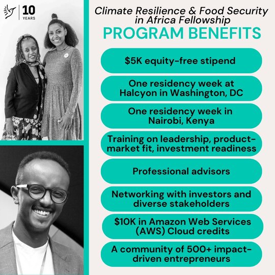 Applications are Open for the Halcyon Climate Resilience & Food Security in Africa Fellowship 2026 for African Startups Admin, November 7, 2025November 7, 2025 Application Deadline: November 20, 2025 The 2026 Halcyon Climate Resilience & Food Security in Africa Fellowship is now open for applications. This prestigious program empowers African entrepreneurs developing sustainable, scalable solutions to tackle climate change, enhance food security, and strengthen climate resilience across the continent. Through an immersive hybrid program, selected founders will participate in a one-week, in-person residency in Accra, Ghana, followed by five virtual sessions, and conclude with a second one-week residency in Nairobi, Kenya. The fellowship offers a unique platform for African innovators to gain expert guidance, investor exposure, and access to a vibrant global network of changemakers. Focus Areas The fellowship targets solutions addressing climate adaptation, resilience, and food systems innovation. Eligible ventures may focus on: Climate-smart agriculture and sustainable food systems Renewable and resilient energy technologies Green infrastructure and adaptive building innovations Climate intelligence and early-warning systems WaterTech for sustainable water management and resilience Blue economy and coastal resilience initiatives Other impactful climate-related technologies and approaches Eligibility Requirements To qualify for the 2026 Halcyon Fellowship, applicants must: Be based in Africa and developing a solution that directly contributes to the UN Sustainable Development Goals (SDGs). Have a working Minimum Viable Product (MVP) with the potential to scale. Provide early evidence of commercial validation, such as pilot results, revenue, or letters of intent. Be 21 years or older by the start of the program. Be fluent in English, as the program is conducted in English. Serve as the CEO or key decision-maker of the venture. Commit to attending all program sessions, including both in-person residencies and virtual meetings. Apply individually or with one co-founder. Program Benefits Fellows will receive comprehensive support designed to accelerate growth and impact. Benefits include: $10,000 in Amazon Web Services (AWS) credits $6,000 equity-free stipend per venture Access to expert-led workshops in product-market fit, fundraising strategy, and leadership development Professional mentorship from industry leaders Opportunities to connect with investors, partners, and global climate stakeholders Lifetime membership in the Halcyon global founder network of over 600 innovators Continued access to alumni benefits and resources Program Timeline October 31, 2025 – Application opens November 20, 2025 – Deadline for eligibility application November 24, 2025 – Invitations sent to shortlisted candidates December 4, 2025 – Invitational application deadline Late December 2025 – Virtual pitch for finalists Mid–Late January 2026 – Selected founders announced March 25, 2026 – Virtual Program Kickoff April 17–24, 2026 – Residency Week #1 in Accra, Ghana May–July 2026 – Virtual Meetings #2–5 July 24–31, 2026 – Residency Week #2 in Nairobi, Kenya Why Apply The Halcyon Climate Resilience & Food Security Fellowship offers African entrepreneurs an unparalleled opportunity to refine their business models, attract investment, and drive measurable social and environmental impact. By combining world-class mentorship, a strong peer network, and practical business support, the program enables founders to scale climate-smart innovations that strengthen Africa’s resilience to climate challenges while creating sustainable livelihoods. Entrepreneurs committed to transforming Africa’s food systems, water security, and renewable energy future are encouraged to apply before the November 20, 2025 deadline. Apply now and join a growing network of visionaries shaping Africa’s climate-resilient future. For more information and to apply, CLICK HERE Be one of the first to see new opportunities, Follow Us on social media: Facebook, Whatsapp Channel, LinkedIn Fellowships & Scholarship opportunities Opportunities for Africans