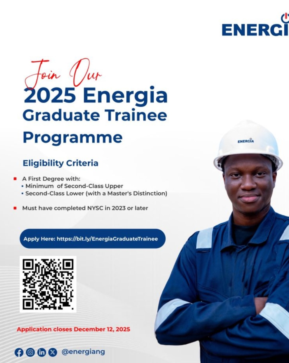 Jobs Applications are Now Open for Energia Graduate Trainee Programme(Nigeria): Shaping the Next Generation of Energy Leaders Admin, December 2, 2025December 2, 2025 Application Deadline: December 12, 2025 At Energia Limited, people are the true source of our energy…. Continue Reading